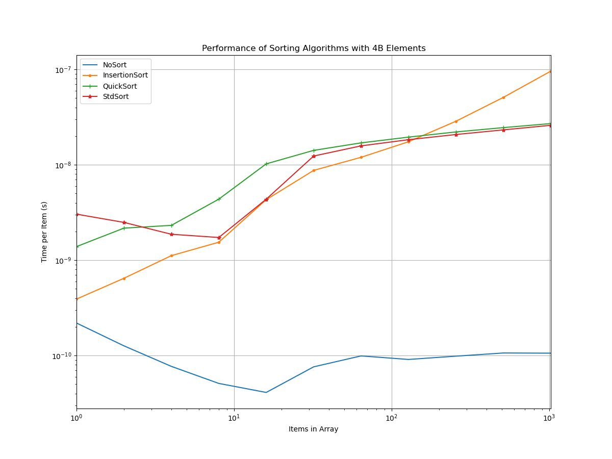 std::sort performed on arrays of 128 32-bit integers. The overhead of using a hybrid algorithm causes degradation of performance for arrays smaller than 8 elements, but then std::sort performs about as well as insertion sort for arrays up to the threshold size of 16 elements. Above the threshold size, it performs slightly better than quicksort due to switching to insertion sort for small partitions.Sorting arrays of integers is a simple example, but the broader point is this: doing extra work is beneficial if that work can be done in an amount of time that would otherwise have been wasted. This phenomenon is only becoming more common as processors become increasingly reliant on caches and branch prediction to keep their execution units busy. The competing effects at play make it more important than ever to base performance-related decisions on measurements rather than guesswork.